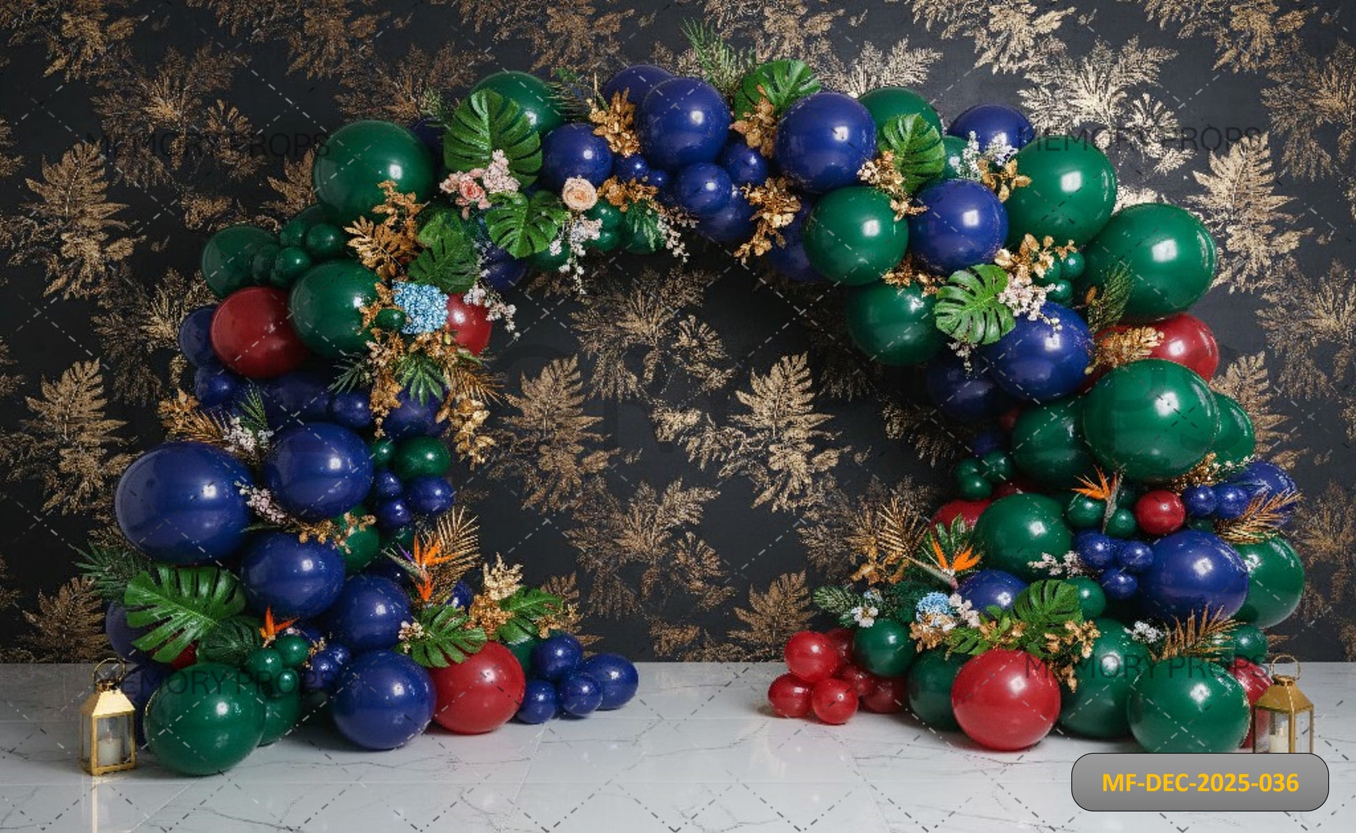 LUXURY EMERALD AND NAVY BALLOON ARCH WITH GOLD FOIL LEAVES - PRINTED BACKDROOP