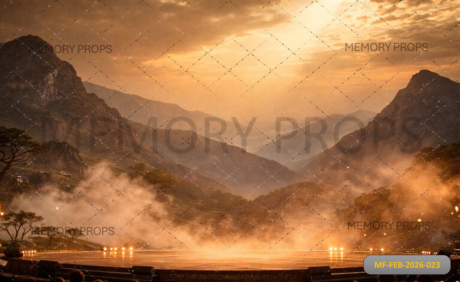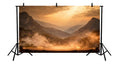 MAJESTIC MOUNTAIN VALLEY AT SUNRISE WITH DRAMATIC MIST, GLOWING STAGE, AND GOLDEN LIGHT - PRINTED BACKDROP