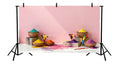 MINIMALIST HOLI FESTIVAL SET WITH COLORFUL POWDER BOWLS, PICHKARIS, AND PINK WALL - PRINTED BACKDROP