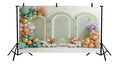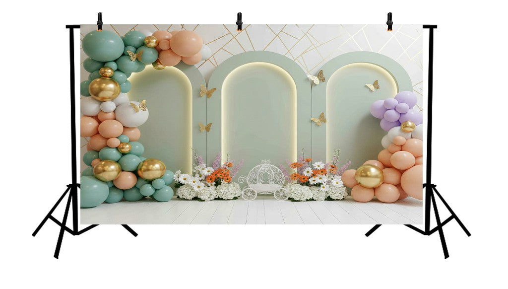 Create a fairytale celebration setting with the Mint Green Triple Arch with Peach Balloons and Cinderella Carriage Printed Backdrop. Featuring elegant mint green triple arches accented with soft peach balloon clusters and a charming Cinderella-style carriage, this backdrop brings storybook magic and royal charm to your event. Perfect for princess-themed birthdays, kids’ parties, baby showers, and enchanting photo shoots, it’s printed in high resolution with pastel tones and delicate details for truly magical, picture-perfect moments.