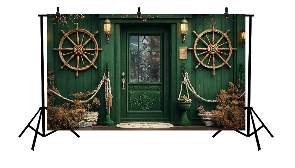NAUTICAL DARK GREEN CABIN DOOR WITH SHIP WHEELS AND ROPE ACCENTS - PRINTED BACKDROP