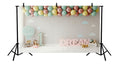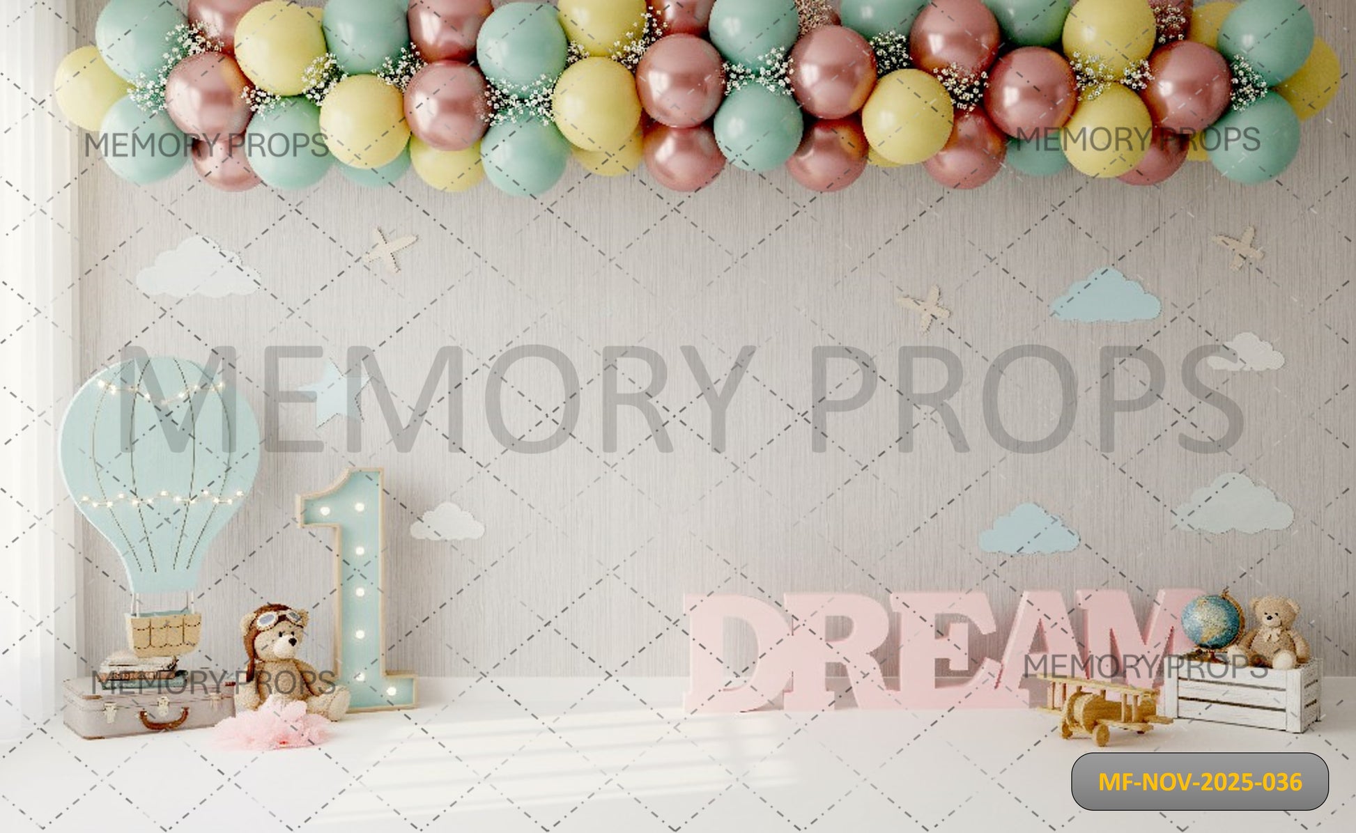 Celebrate a magical milestone with this dreamy Pastel Hot Air Balloon First Birthday printed backdrop. Designed in gentle shades of baby pink, blue, peach, and mint, it features adorable hot air balloons floating among fluffy clouds, creating a whimsical sky-perfect setting for little ones. Soft watercolour textures, tiny stars, and playful details add charm and innocence to the scene, making it ideal
