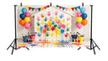 PLAYFUL HOLI HANDPRINT STUDIO WITH WHITE WOODEN HOUSE, BALLOONS, AND PAINT BUCKETS - PRINTED BACKDROP