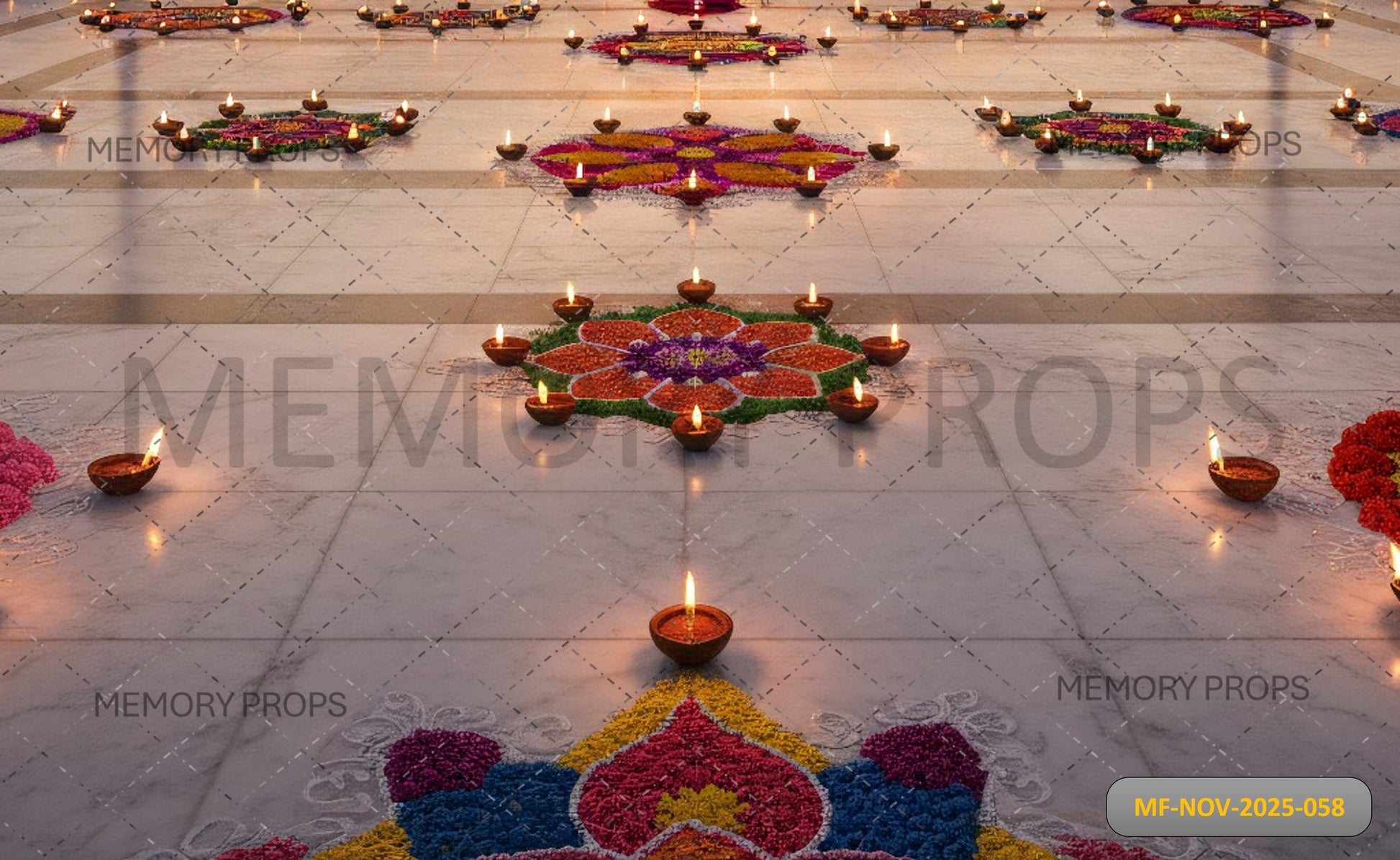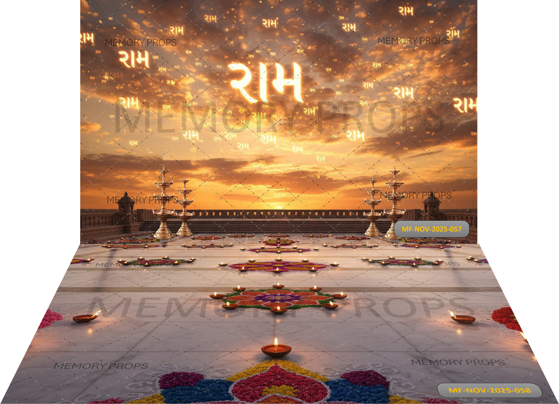 RAM NAME SUNSET DIYA + MANDIR INTERIOR MARBLE FLOOR DIYA RANGOLI BACKDROP
