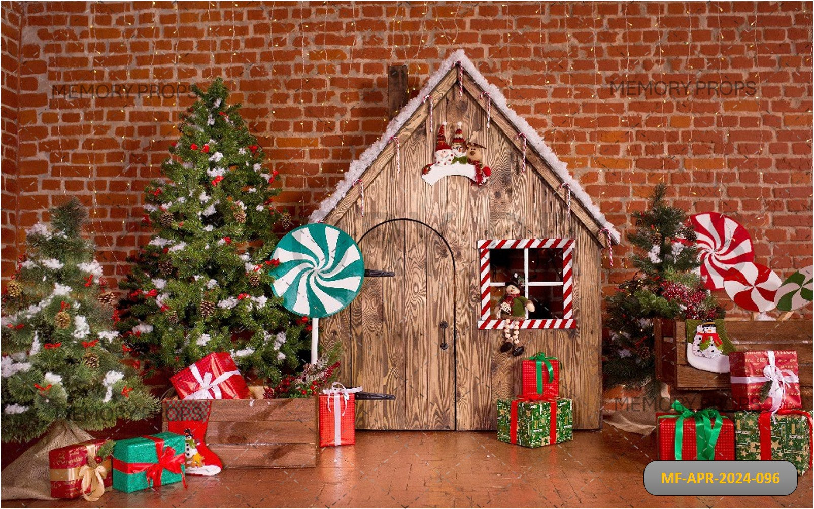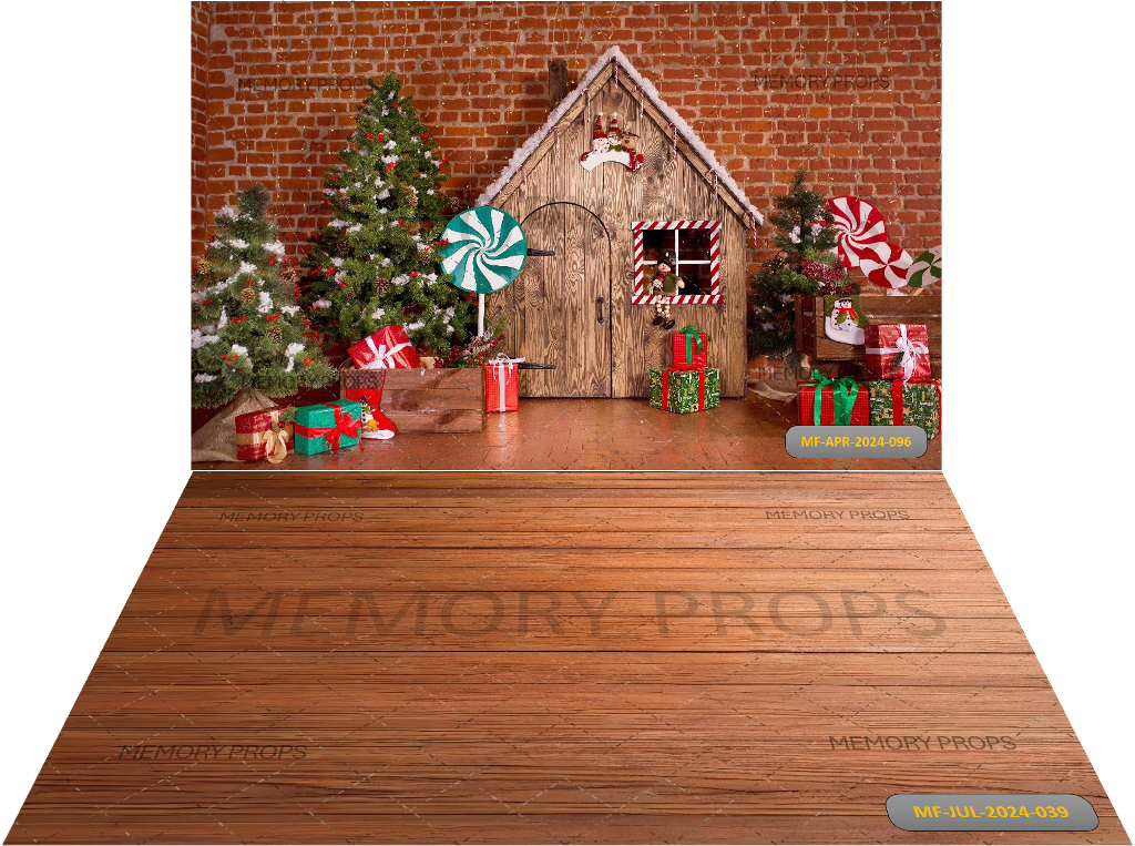 Capture the festive charm with a red brick wall adorned with Christmas decorations, complemented by a rustic brown wooden textured floor. Perfect for holiday-themed photography and seasonal celebrations.