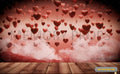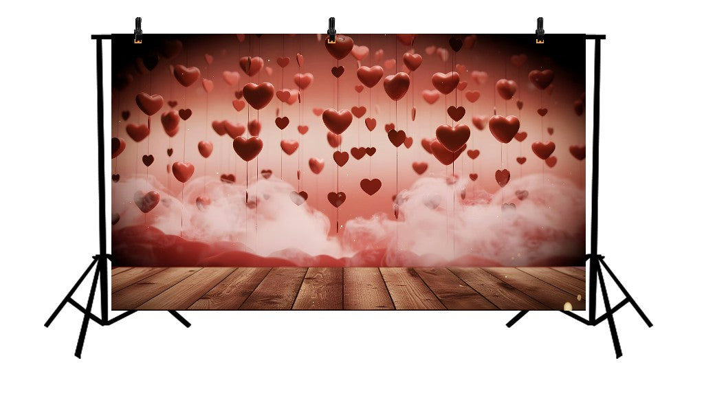 A warm pink-to-rose gradient background enhances the romantic mood, while the rustic wooden floor grounds the setup with a cozy, studio-friendly contrast. The combination of rich reds, soft pink mist, and layered heart elements makes this backdrop visually striking yet tender.