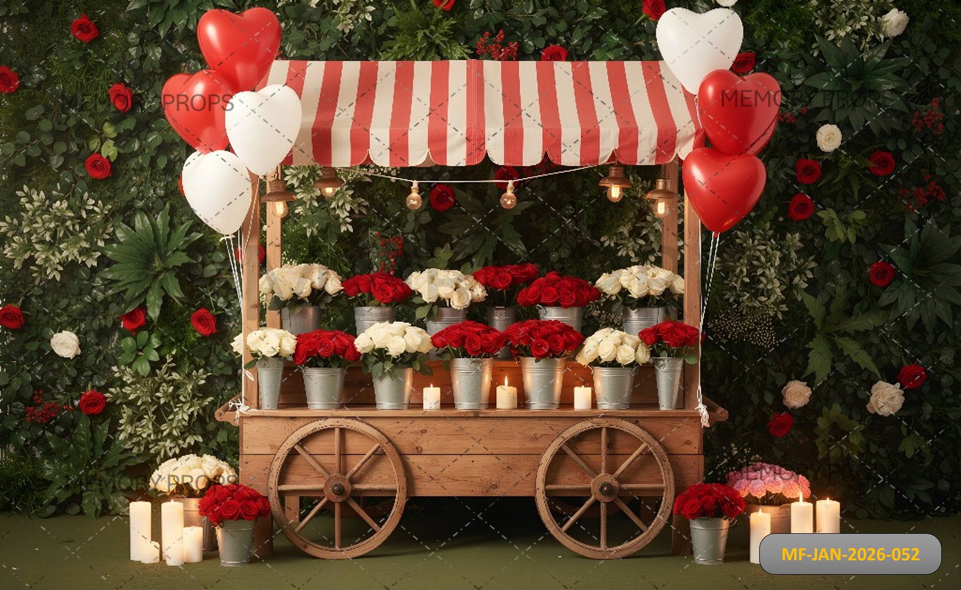 ROMANTIC VALENTINE FLOWER CART WITH RED AND WHITE ROSES, STRIPED AWNING, AND HEART BALLOONS - PRINTED BACKDROP