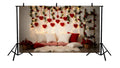 ROMANTIC VALENTINE WHITE BRICK WALL WITH HANGING RED HEARTS, ROSE GARLANDS, AND COZY PILLOW NOOK - PRINTED BACKDRO