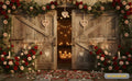 This professional studio background, categorized under Studio Backgrounds in Lighting & Studio, features rustic weathered wooden barn doors slightly ajar to reveal a warm, candlelit interior. The entryway is elegantly framed with lush red and blush rose vines, while the floor is covered in a path of scattered rose petals. Accented with hanging wicker hearts and glowing pillar candles, this backdrop creates a cozy, high-end atmosphere perfect for Valentine's Day, rustic weddings, or romantic themed photography.