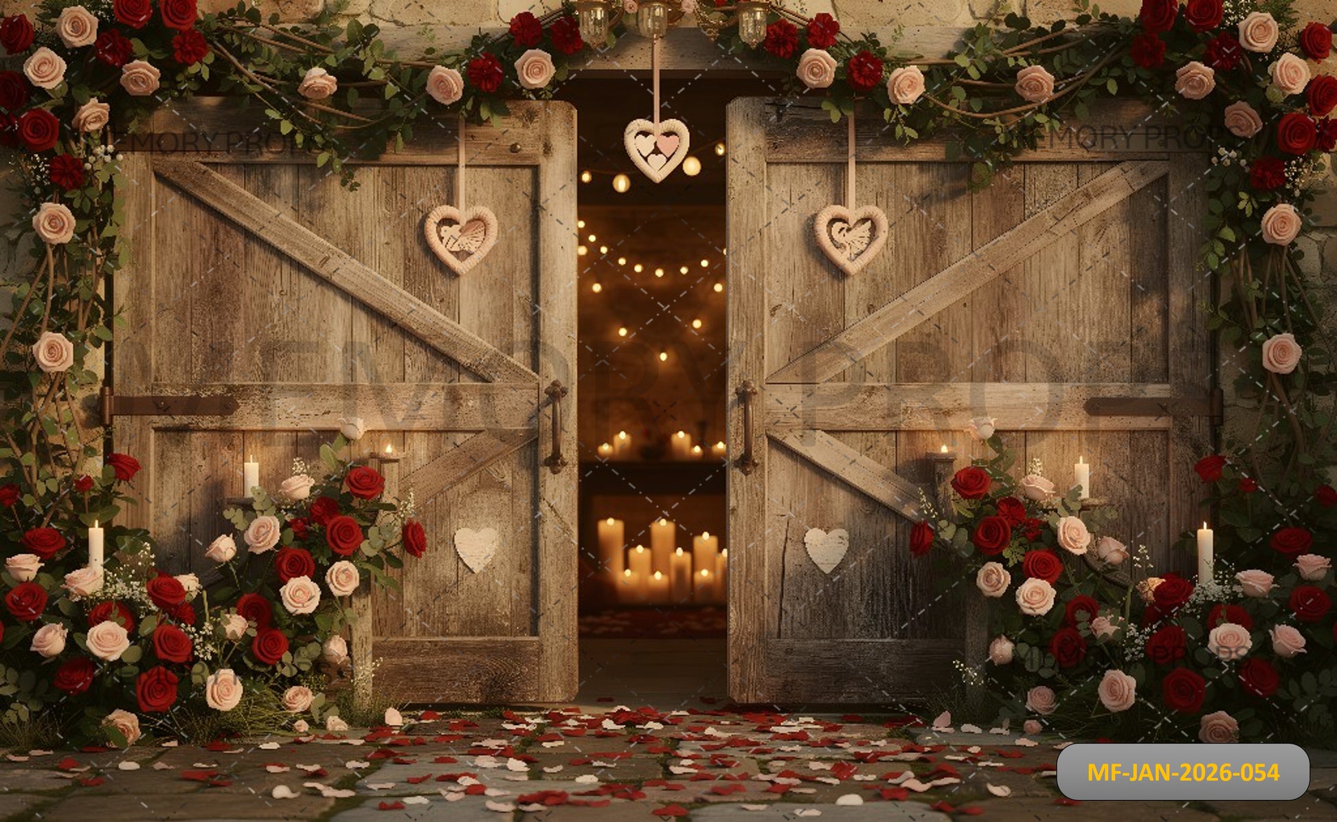 ROMANTIC VINTAGE BARN DOORS WITH RED ROSES, CANDLELIGHT, AND HANGING HEARTS - PRINTED BACKDROP