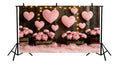 Add warmth and charm to your setup with this rustic romantic heart backdrop, featuring soft plush pink heart cushions suspended against a dark wooden wall, illuminated by warm fairy lights. Lush pink florals arranged in wooden crates and gentle tulle fabric at the base complete the scene, creating a cozy, intimate, and elegant atmosphere.