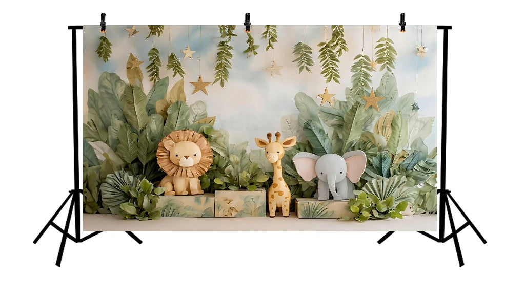 This backdrop features a lively jungle landscape filled with adorable safari animals — friendly lions, elephants, giraffes, zebras, and monkeys — all surrounded by lush greenery, tropical leaves, and warm earthy tones. The playful yet natural design creates an atmosphere of exploration, perfect for little adventurers and nature lovers alike.