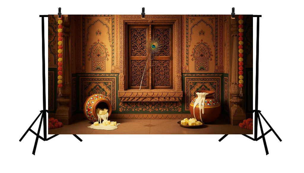 Enter Krishna’s mischievous world with a whimsical palace filled with pots of butter, golden textures, and joyful charm — capturing the playful spirit of Makhan Chor. Perfect for Janmashtami celebrations, baby Krishna portraits, and devotional shoots filled with sweetness and delight.