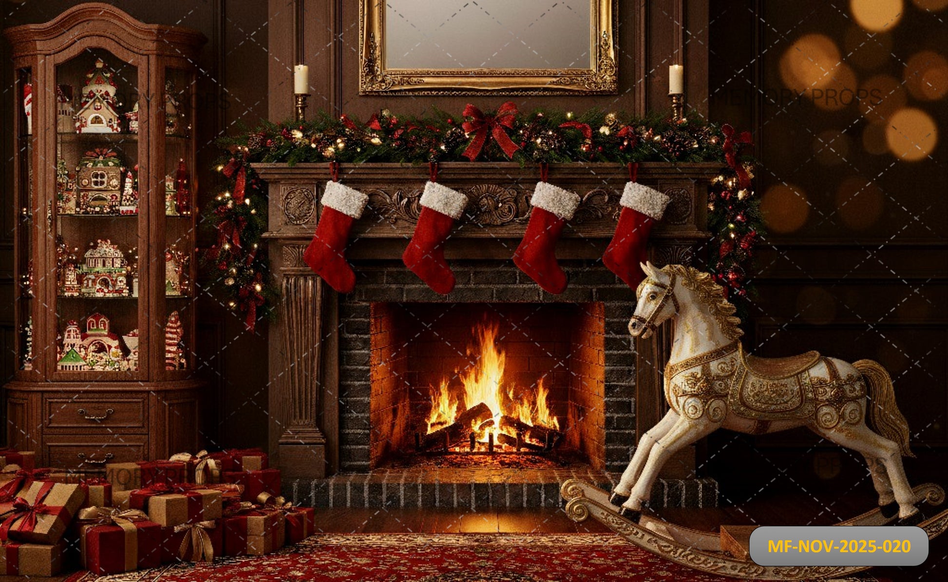 The Traditional Christmas Fireplace and Stockings Printed Backdrop captures the cozy warmth and nostalgia of a classic holiday living room. At its center is a beautifully crafted stone or brick fireplace, glowing with soft, golden firelight that instantly adds a comforting, festive ambiance.