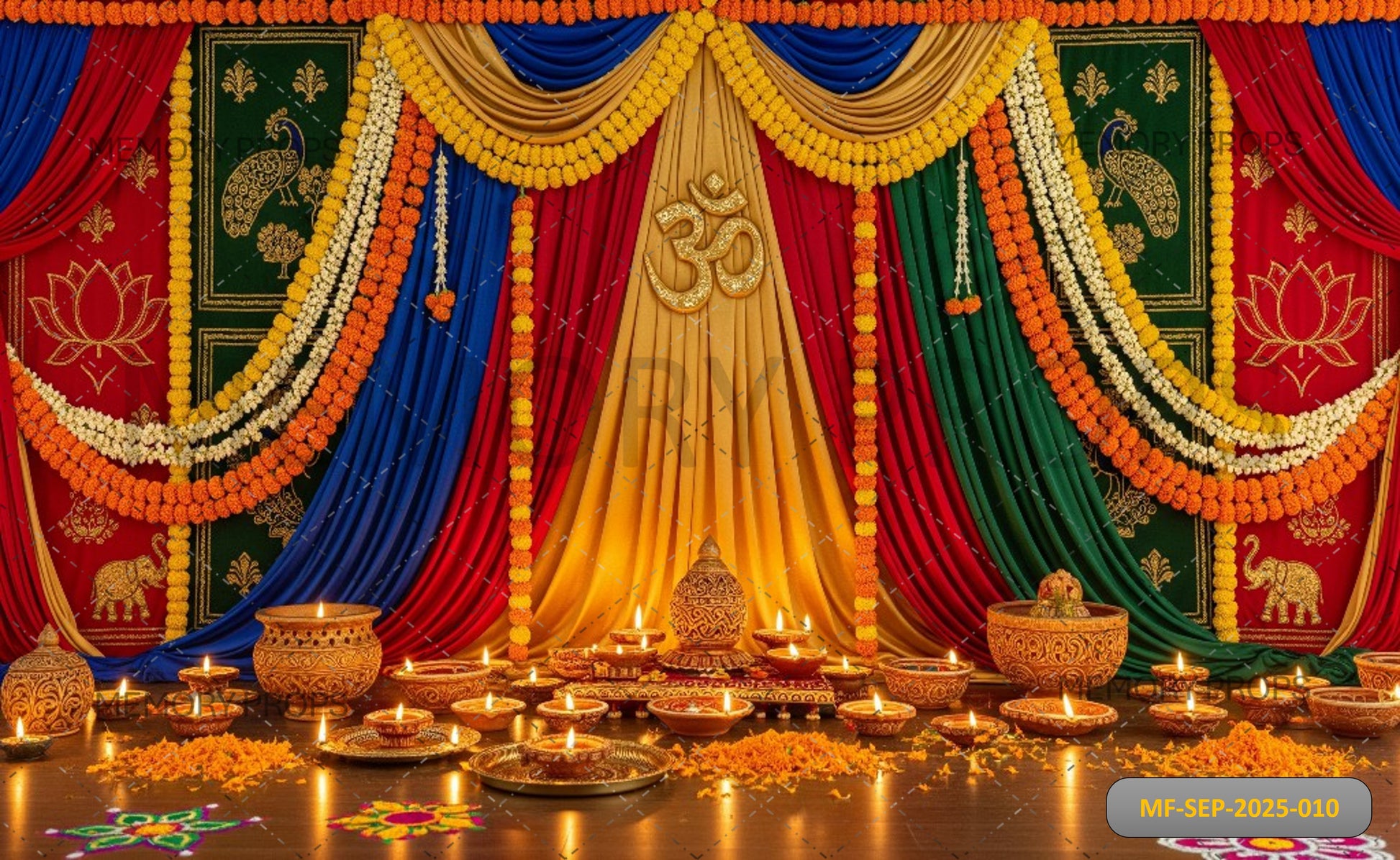 An opulent backdrop featuring glowing diyas, rangoli patterns, and intricate festive details, the Traditional Diwali Stage backdrop sets the perfect scene for celebrations, rituals, and timeless cultural moments.