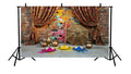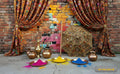 TRADITIONAL INDIAN HOLI SETUP WITH EMBROIDERED CURTAINS, ORNATE UMBRELLA, AND BRASS POTS - PRINTED BACKDROP