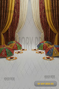 A vibrant setup featuring colourful umbrellas, festive marigolds, and a playful floor design — perfect for capturing cultural charm with kids in the spotlight.