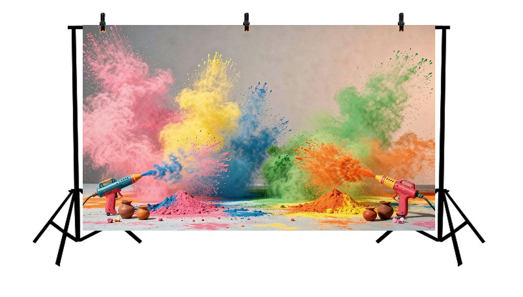 VIBRANT HOLI PICHKARI BLAST WITH DRAMATIC MULTICOLOR POWDER CLOUDS AND GULAL HEAPS - PRINTED BACKDROP
