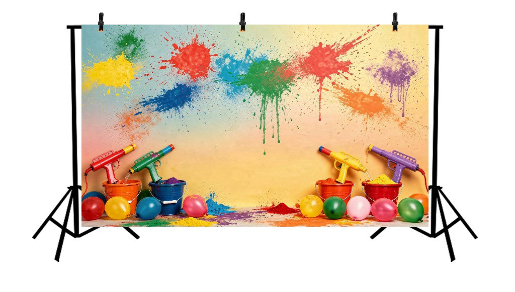 VIBRANT HOLI SQUIRT GUN STUDIO WITH COLORFUL PAINT SPLATS, BUCKETS, AND BALLOONS - PRINTED BACKDROP