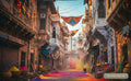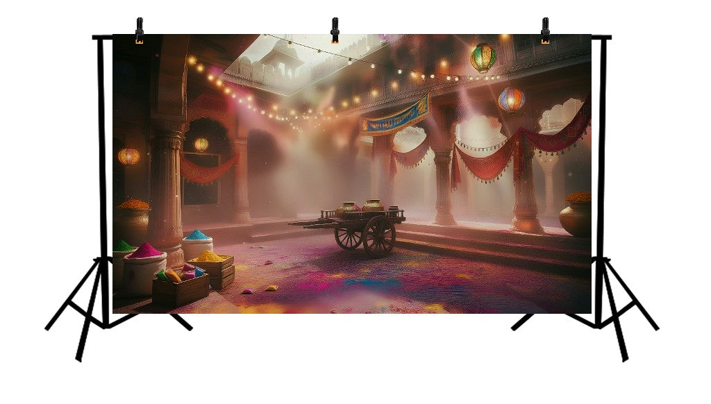 VIBRANT HOLI STREET CELEBRATION IN ANCIENT INDIAN TOWN WITH COLORFUL GULAL AND FESTIVE DECORATIONS - PRINTED BACKDROP