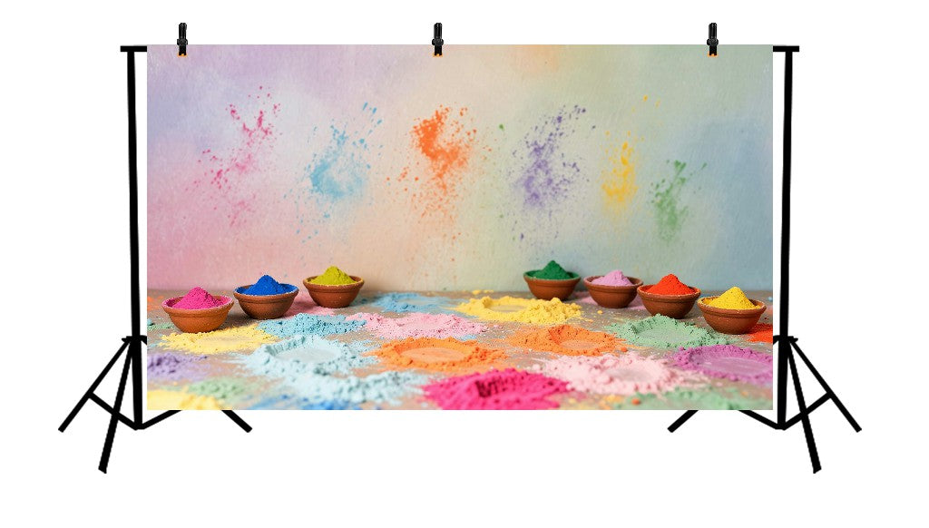 VIBRANT MINIMALIST HOLI STUDIO WITH GULAL BOWLS AND PASTEL POWDER SMUDGES - PRINTED BACKDROP