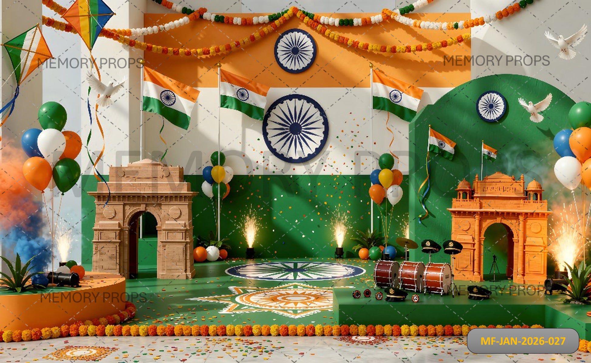 A colourful printed backdrop designed for Republic Day celebrations, featuring iconic Indian monuments arranged in a vibrant stage setting. The scene is enhanced with elements inspired by the Indian tricolour, symbolizing unity, pride, and national heritage. Bright yet balanced lighting adds depth and a festive atmosphere, making the backdrop visually striking and celebratory. Ideal for Republic Day functions, school and college programs, stage décor, cultural events, exhibitions, and patriotic photography, this high-resolution backdrop reflects the spirit, history, and pride of India.
