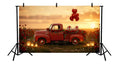 VINTAGE RED VALENTINE PICKUP TRUCK IN ROSE FIELD AT SUNSET - PRINTED BACKDROP